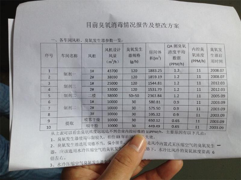 廣東一方制藥有限公司從2003年開始就采用了臭氧來對各個制劑、提取車間來作為主要殺菌消毒方式,并且采用了中央空調(diào)投加的較好投加臭氧方式,然而,該公司使用的臭氧發(fā)生器為陶瓷片臭氧發(fā)生器,產(chǎn)量不足,濃度較低,常年使用導致臭氧衰減,等等,導致其在檢測時,臭氧濃度只能達到2ppm,細菌數(shù)一直不達標。于是,我司根據(jù)客戶的車間情況針對性的為該公司做了整體整改,將陶瓷片臭氧發(fā)生器改為石英管材質(zhì)的氧氣源臭氧發(fā)生器,臭氧濃度達到11ppm以上,達到食品廠臭氧消毒標準,于是細菌數(shù)不再被檢測到。